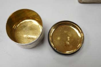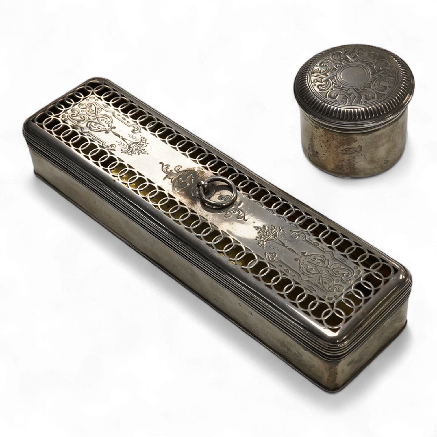 A George III silver circular counter box and cover, by John Linnet, London, 1816, top diameter 47mm, together with a similar silver toilet box with pierced cover, London, 1814.