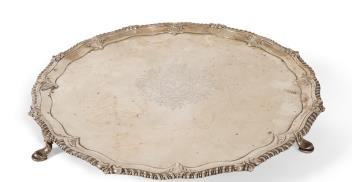 A George III silver salver by Richard Rugg, of shaped circular form, with gadrooned, foliate border and engraved armorial, on three hoof feet, London, 1771, diameter 33.6cm, 34.9oz.