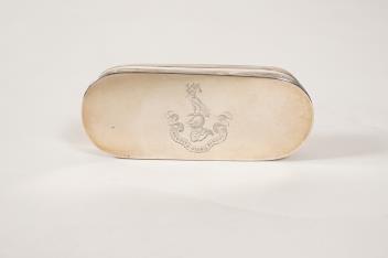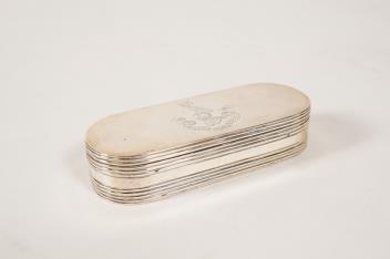 A George III silver snuff box by William Parker & Benjamin Simpson, of oval form, with reeded sides, the hinged cover with engraved armorial and the motto 'Quo Pax & Gloria Duccunt', London, 1799, length 94mm.