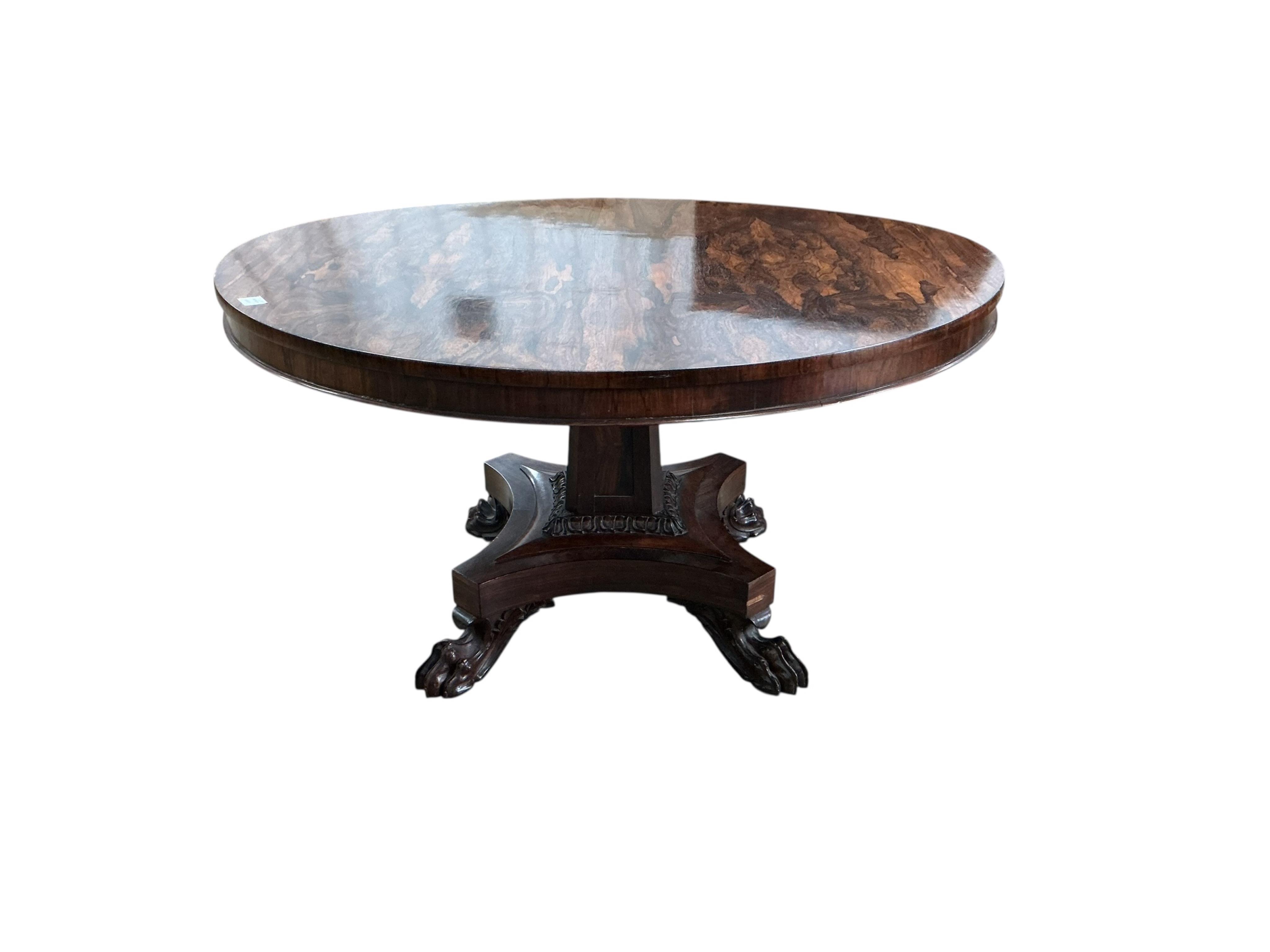 Lot 204 , A George IV rosewood tilt top breakfast table, diameter 130cm, height 73cm together with four chairs