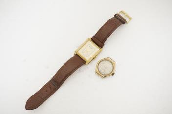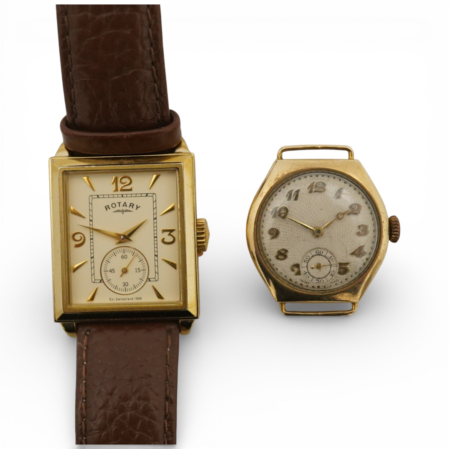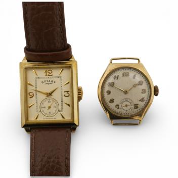 Lot 1101 , A George V 9ct gold manual wind wrist watch, with Arabic dial and subsidiary seconds, case diameter 26mm, case hallmarked for Chester, 1929, no strap, together with a gentleman's gilt steel Rotary quartz wrist watch, on