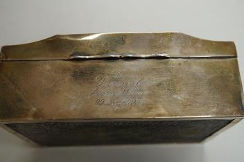 Lot 1849 , A George V part engine turned silver mounted cigarette box, by Clark & Sewell, with serpentine lid and engraved inscription, Birmingham, 1928, length 12.9cm.