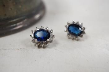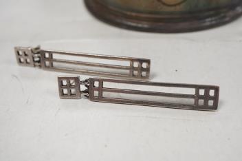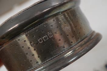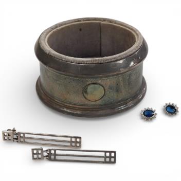 Lot 1836 , A George V part engine turned silver trinket box, with no cover, London, 1910, diameter 9cm, together with a pair of 925 drop earrings and a pair of paste ear studs.