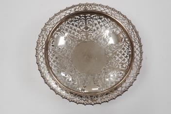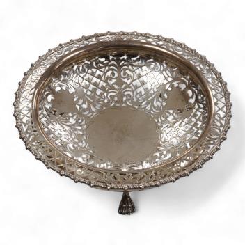 Lot 1836 , A George V pierced silver bowl, with gadrooned border, on three paw feet, James Dixon & Sons, Sheffield, 1931, diameter 20.8cm, 15oz.