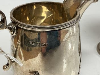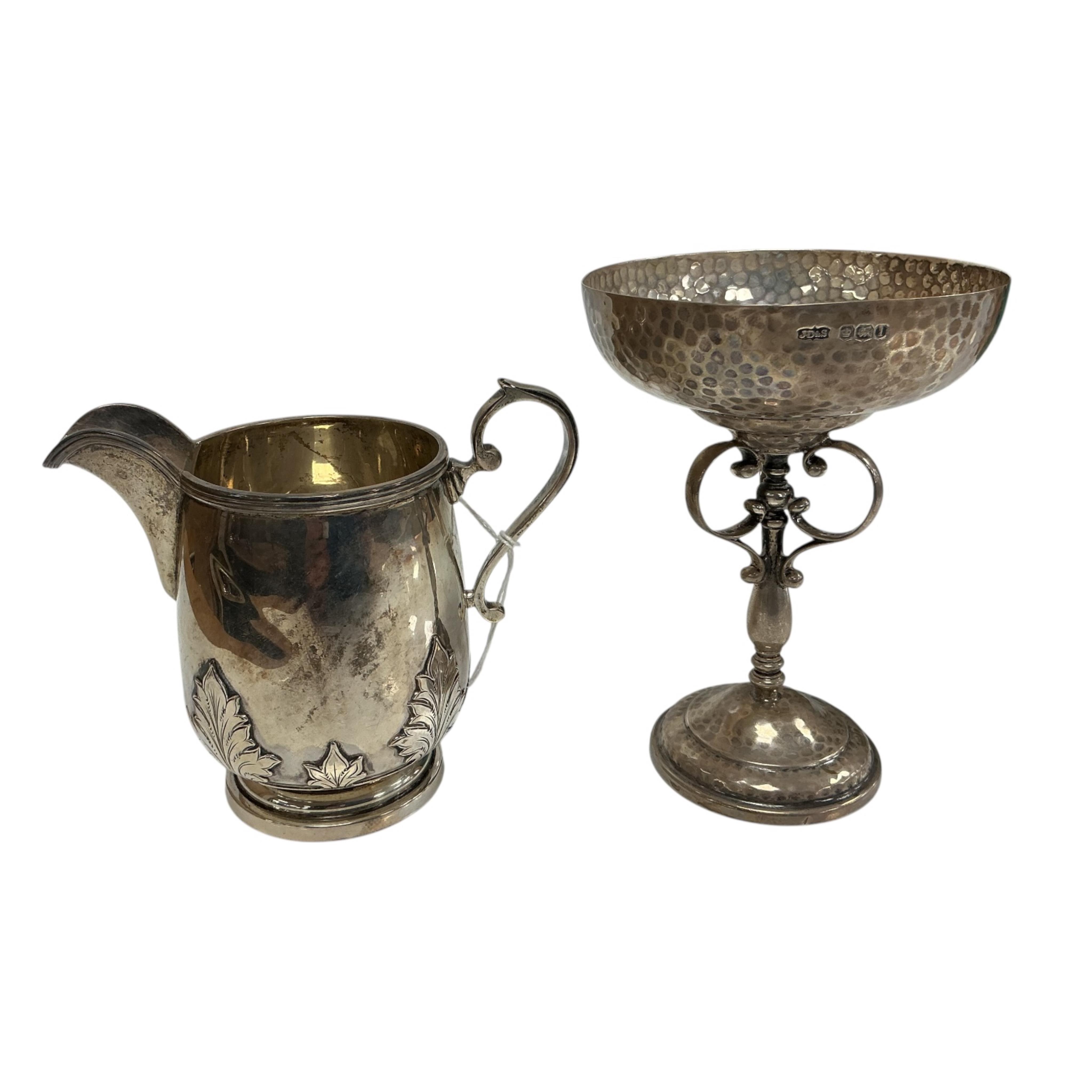 A George V planished silver presentation cup, with golf related inscription, James Dixon & Sons, Sheffield, 1928, on turned stem with scroll tripod supports, together with a George V silver cream jug with card cut decoration, by Walker & Hall, 10.8oz.
