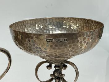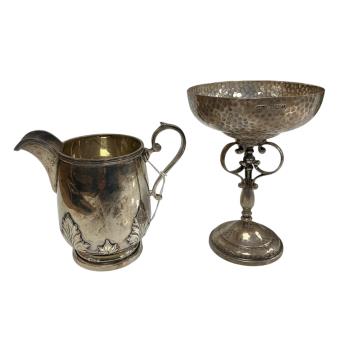 Lot 1838 , A George V planished silver presentation cup, with golf related inscription, James Dixon & Sons, Sheffield, 1928, on turned stem with scroll tripod supports, together with a George V silver cream jug with card cut decora