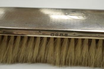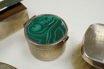 Lot 871 , A George V silver mounted hand mirror and clothes brush, Birmingham, 1928, a George V silver mounted cigarette box, a silver mounted cut glass toilet jar and two modern 925 pill boxes.