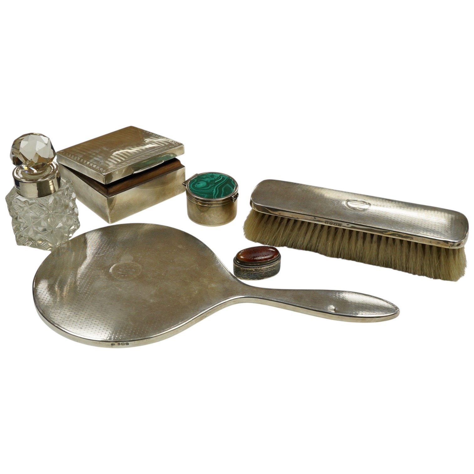 A George V silver mounted hand mirror and clothes brush, Birmingham, 1928, a George V silver mounted cigarette box, a silver mounted cut glass toilet jar and two modern 925 pill boxes.