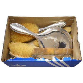 Lot 835 , A George V silver mounted nine piece dressing table set, by Boots Pure Drug Company, Birmingham, 1916/17, comprising a hand mirror, two clothes brushes, two hair brushes, a glass toilet jar, comb and two nail implements.