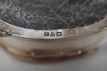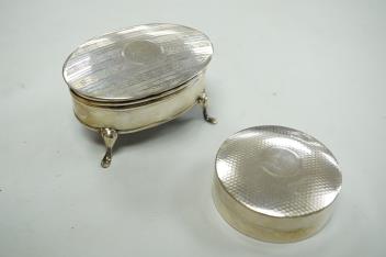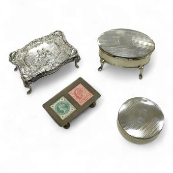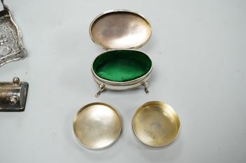 Lot 1830 , A George V silver mounted oval trinket box, Clark & Sewell, Chester, 1924, 65mm, together with a small silver circular pill box and cover, a 925 double stamp box, and a late Victorian continental silver miniature model o