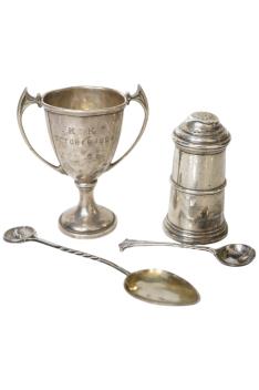 Lot 3875 , A George V silver pepperette, Sheffield, 1901, 63mm, a small silver trophy cup and two small silver spoons.