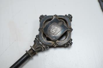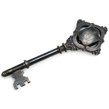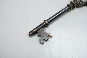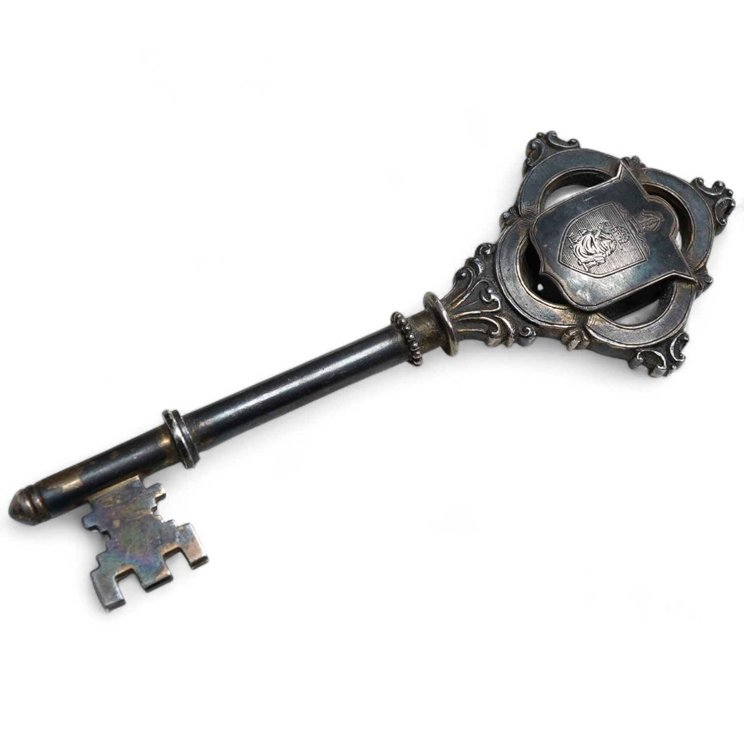 Lot 846 , A George V silver presentation? key, engraved with the crest depicting a seated Bishop with mitre above, William James Dingley, Birmingham, 1927, 10.2cm.