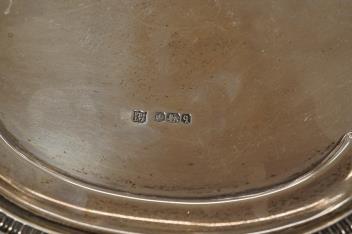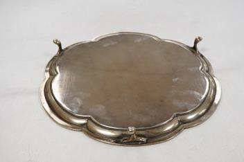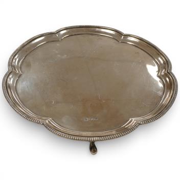 Lot 1837 , A George V silver salver, of cusped circular form, on three feet, by Fenton Brothers Ltd, Sheffield, 1933, diameter 25.7cm, 19oz.
