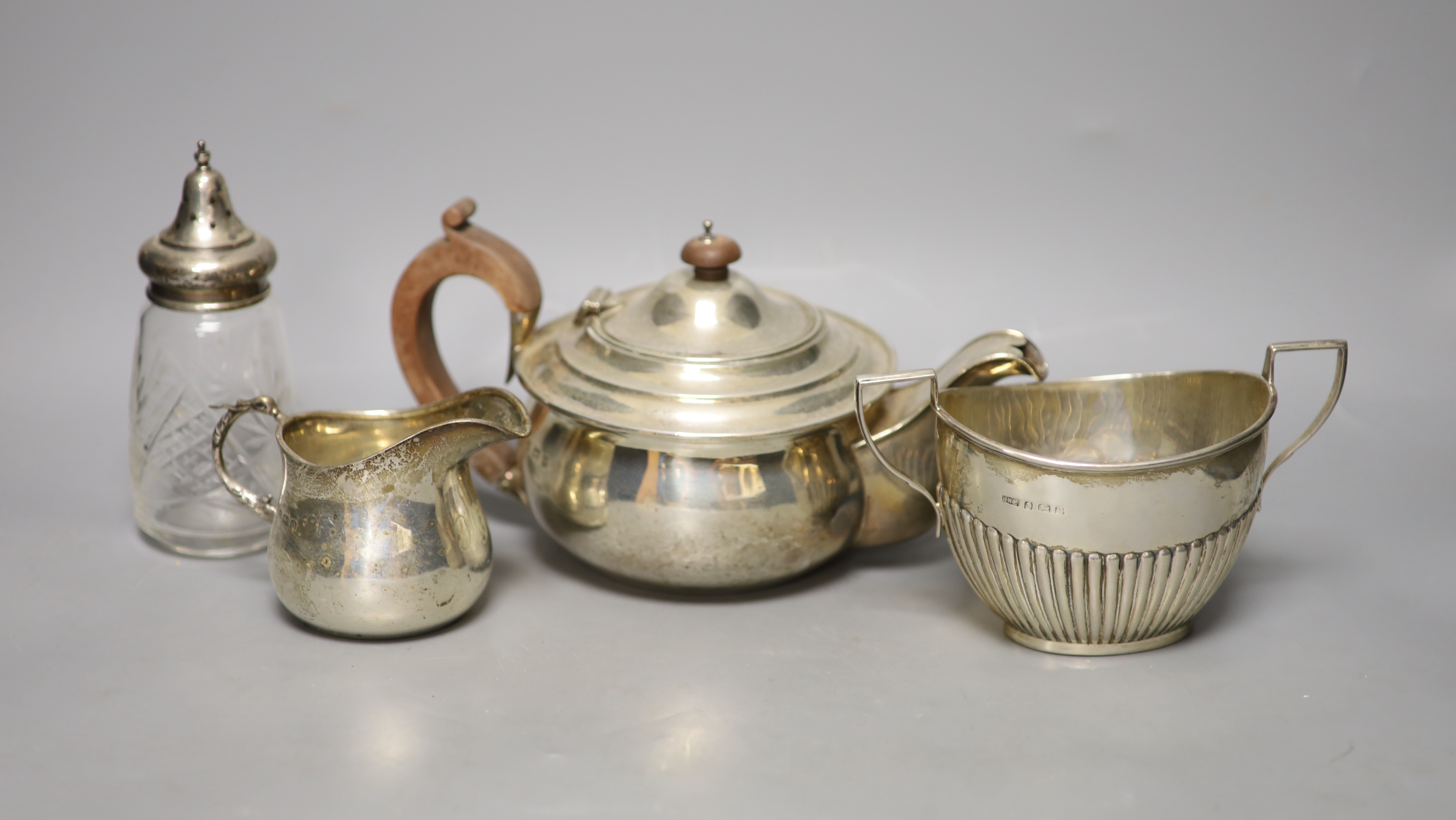 A George V silver teapot, Birmingham, 1913, a similar cream jug and sugar bowl and a silver mounted glass sugar sifter,