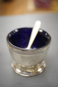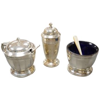 Lot 843 , A George V silver three piece condiment set by Deakin & Francis, Birmingham, 1928, together with two associated spoons, one silver.