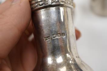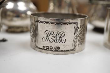 A George V silver three piece condiment set by Walker & Hall, Sheffield, 1921, together withy two other silver condiments, three assorted silver condiment spoons and four assorted silver napkin rings.