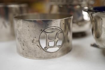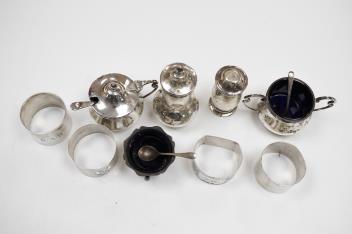 Lot 836 , A George V silver three piece condiment set by Walker & Hall, Sheffield, 1921, together withy two other silver condiments, three assorted silver condiment spoons and four assorted silver napkin rings.