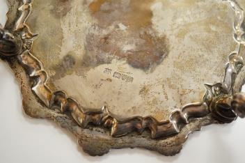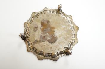 Lot 1864 , A George V silver waiter, by Barker Brothers, Chester, 1911, with shell and scroll border, on three scroll feet, 15.7cm, 4.5oz.