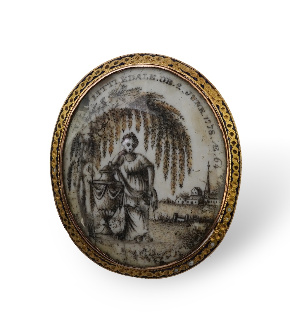 A Georgian ivory miniature mourning brooch, circa 1775, set with an oval ivory panel depicting a figure leaning against a classical urn beneath a willow tree of hairwork, with a townscape in the background, inscribed to the border 'WILLM LITTLEDALE OB 2 JUNE 1778 AE 64', within a patterned border accented with black enamel, the reverse inscribed 'Isabel Littledale ob't 8 Dec'r 1775 Ae't 61', mounted in gold, length 3cm, gross weight approximately 11 grams CITES Submission reference WFXX27GQ