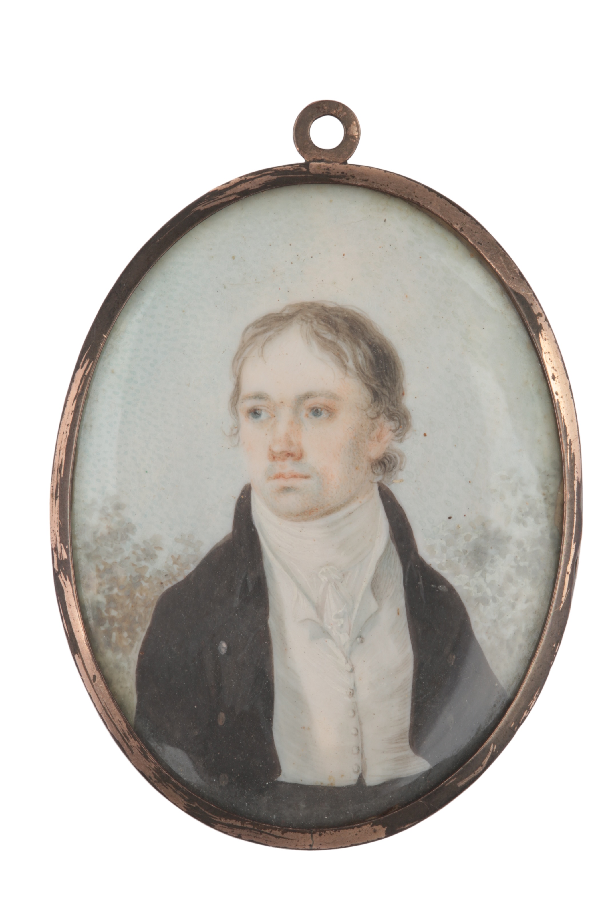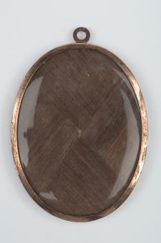 A Georgian ivory miniature portrait brooch, early 19th century, of oval outline, depicting a man in Regency dress, the reverse with woven hairwork, mounted in gilt metal, length 7.6cm. CITES Submission reference TKJ979RF