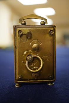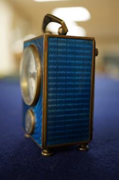 Lot 412 , A German Mayer brass and blue guilloche enamel travelling timepiece with alarm, 8cm