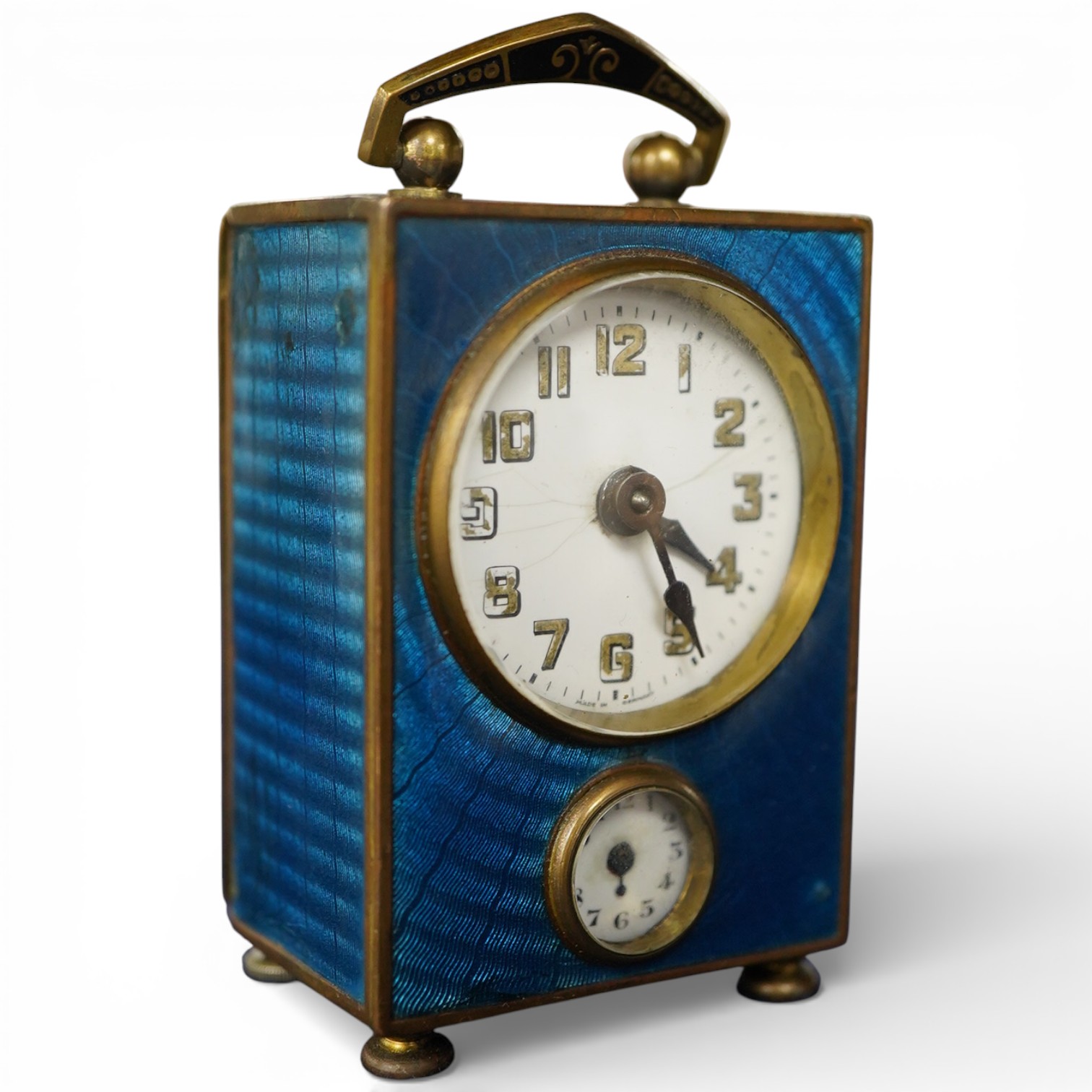 A German Mayer brass and blue guilloche enamel travelling timepiece with alarm, 8cm