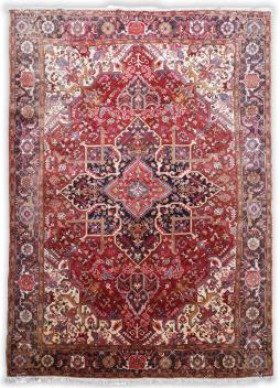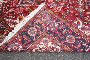 A Heriz red ground carpet woven with a central lobed medallion within a floral and geometric field and wide conforming border, 402 x 300cm