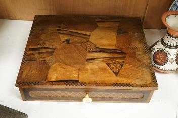 A Japanese Hakone ware marquetry box, with drawer and bone handle, 39cm wide x 32cm deep x 8.5cm high