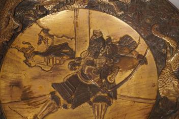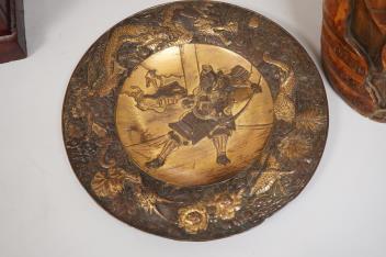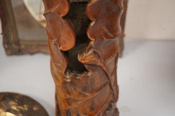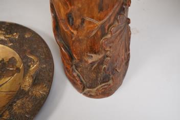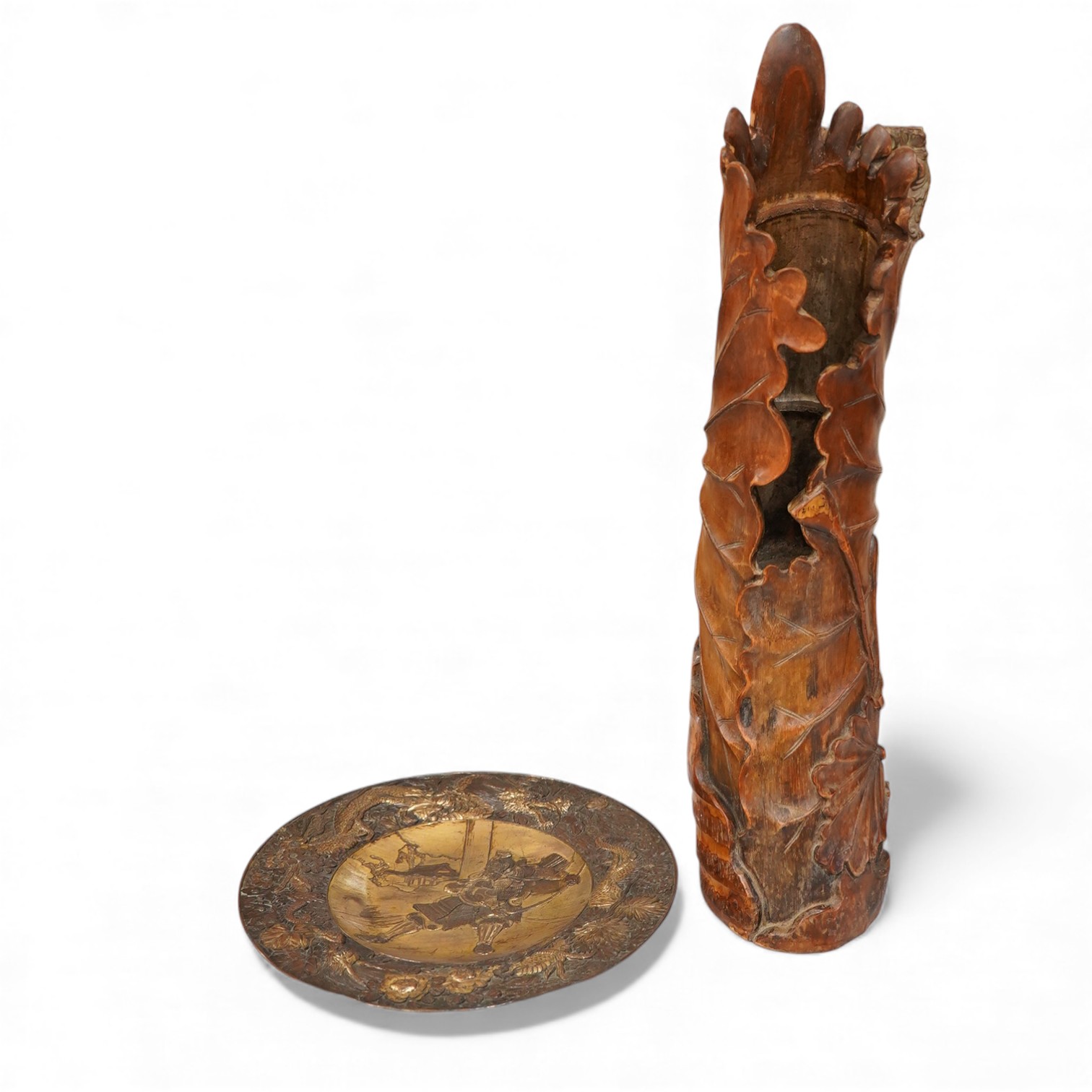 Lot 1400 , A Japanese bronzed antimony dish and a large carved bamboo ‘lotus’ vase - 61.5cm high. (2)