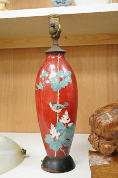 Lot 1269 , A Japanese cloisonne red ground bird decorated lamp, 44.5cm high including fitting