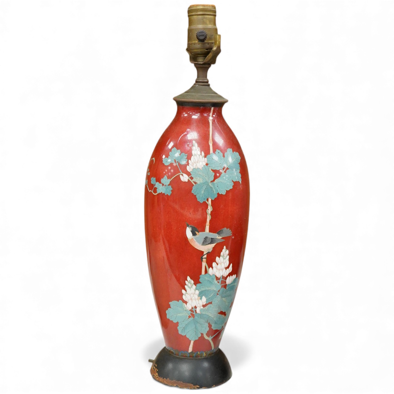 A Japanese cloisonne red ground bird decorated lamp, 44.5cm high including fitting