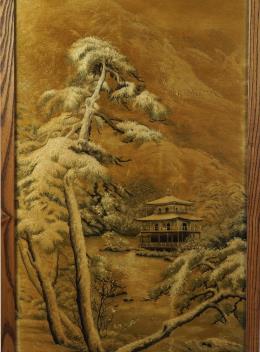 Lot 12 , A Japanese embroidered silk picture of Kinkaku-ji, 'Temple of the Golden Pavilion' in Kyoto, Meiji period (1868-1912)
