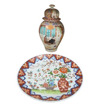 Lot 440 , A Japanese enamelled porcelain vase and cover, six character mark and a similar dish, Meiji period, dish diameter 37cm, vase height 36cm, (2).