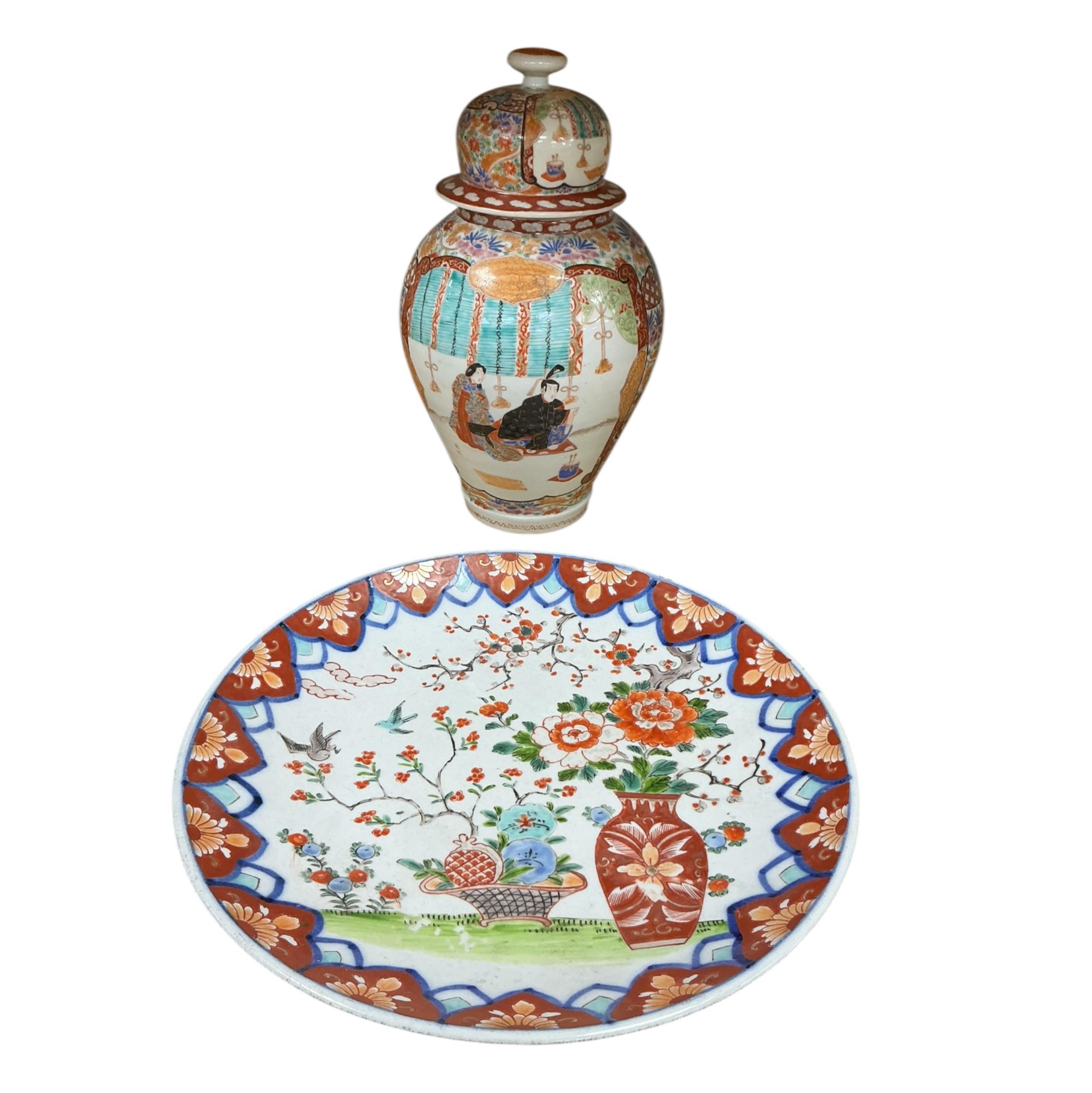 A Japanese enamelled porcelain vase and cover, six character mark and a similar dish, Meiji period, dish diameter 37cm, vase height 36cm, (2).
