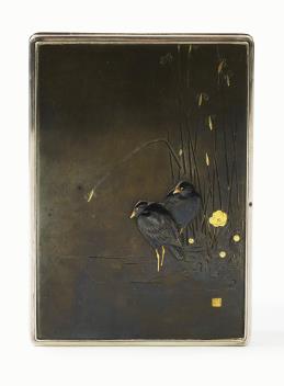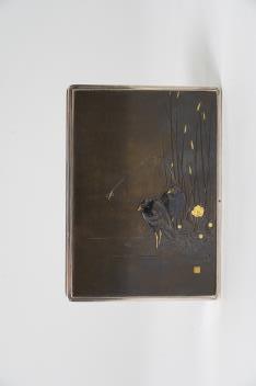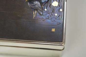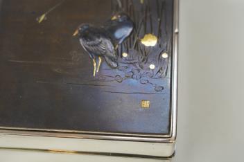A Japanese shibuichi and shakudo mounted silver box and cover, Taisho period, the cover relief decorated with two wading birds in a pond, gold seal mark, the interior finished in takamakie lacquer, seven character seal mark to the interior, 14cm x 10cm