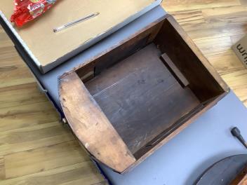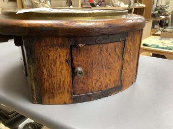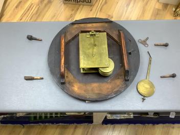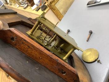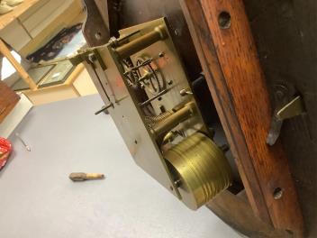 Dial seems to have been poorly varnished; dial with chipped blemish to enamel off-centre, see image; with key and pendulum but not tested; oak veneers missing at bottom of box-back, see image.