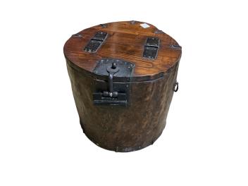 A Korean iron mounted elm trunk / chest, diameter 45cm, height 42cm