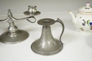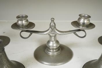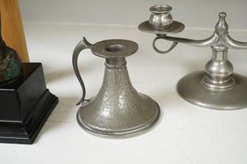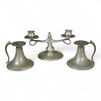 Lot 1471 , A Liberty Tudric pewter two branch candlestick, 22cm wide and two hammered candle holders.