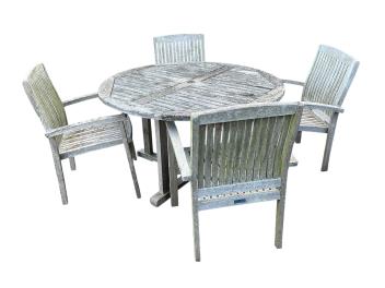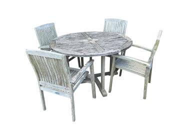 A Lindsey circular weathered teak garden table, diameter 130cm and four chairs