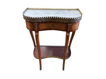 A Louis XVI style kidney shaped two tier side table, width 61cm, with white and grey veined marble inset top, depth 33cm, height 76cm