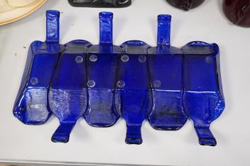 A Mary Canny six sectioned blue bottle art glass tray, 36.5cm deep x 51cm wide