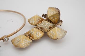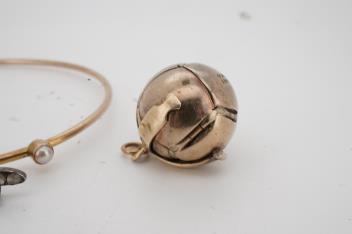 Lot 2978 , A Masonic ball pendant and a pearl and diamond bangle, early 20th century, the Masonic ball folding open to reveal a cross shape engraved with Masonic symbols, in gilt silver, length 2.2cm when closed, stamped Silver & G