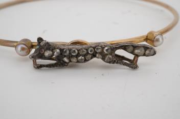 A Masonic ball pendant and a pearl and diamond bangle, early 20th century, the Masonic ball folding open to reveal a cross shape engraved with Masonic symbols, in gilt silver, length 2.2cm when closed, stamped Silver & Gold; and a bangle centring on a fox set with rose-cut diamonds, its eyes set with pastes, between collet-set split pearls, mounted in silver and gold, inner circumference approximately 16.8cm, gross weight approximately 6 grams, pearls untested