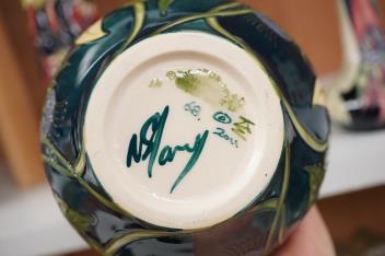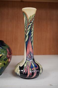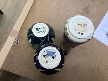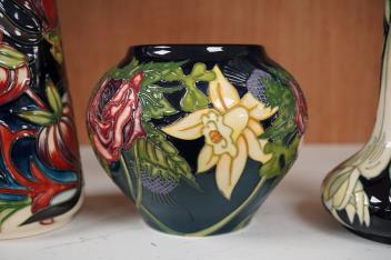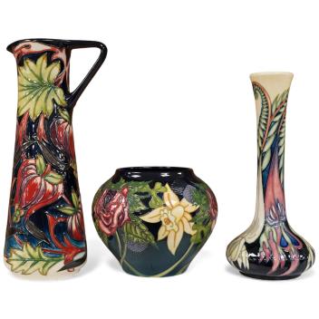 Lot 1373 , A Moorcroft Diamond Jubilee vase, a Red Ribbon pattern ewer and a Kaka Beak pattern vase, largest 24cm high