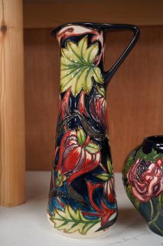 A Moorcroft Diamond Jubilee vase, a Red Ribbon pattern ewer and a Kaka Beak pattern vase, largest 24cm high