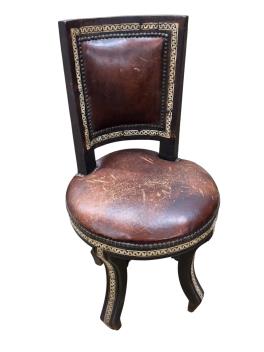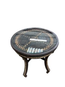 Lot 30 , A Moroccan circular studded cedar glass top bistro table, diameter 80cm, height 76cm together with two matching chairs
