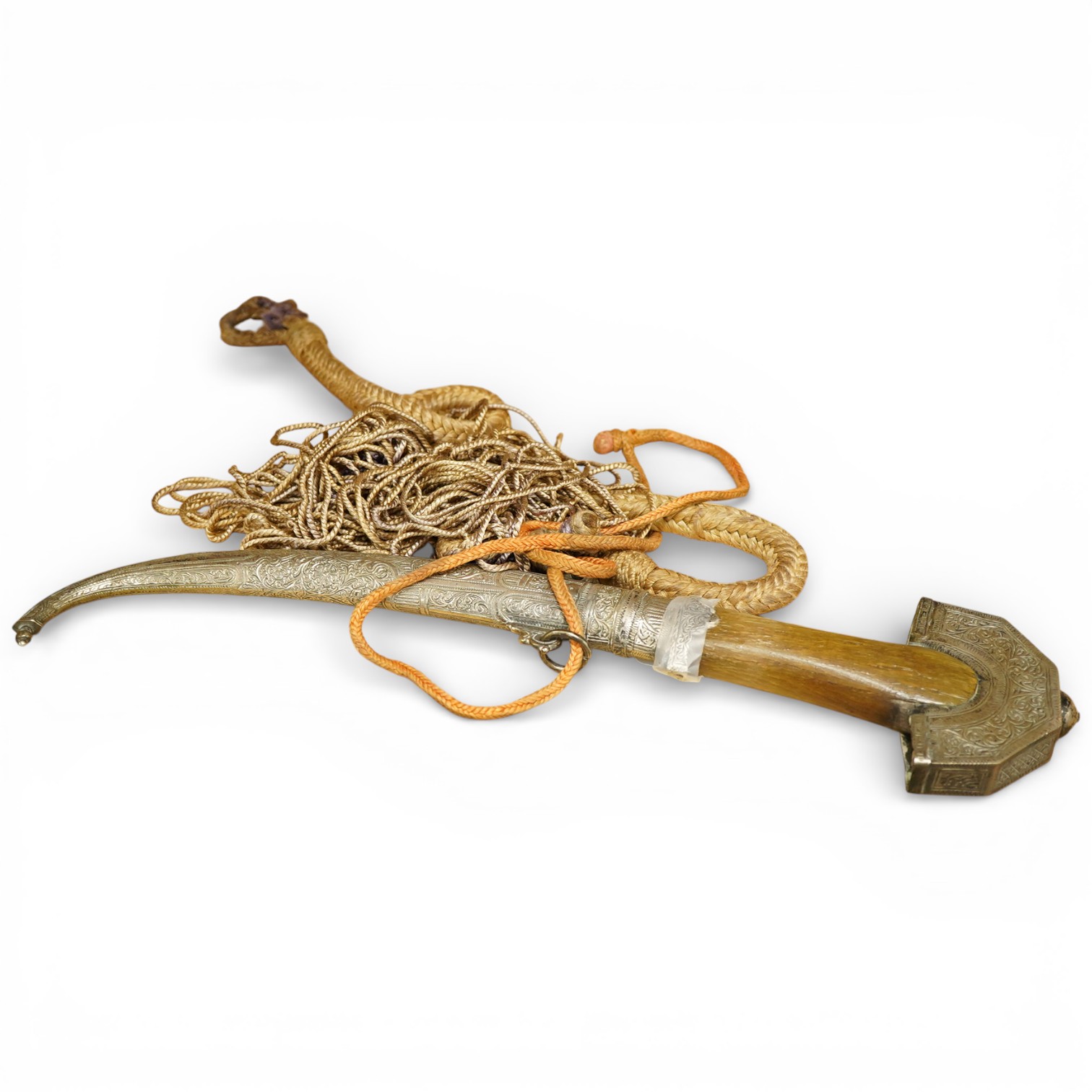 A Moroccan white metal mounted dagger Jambiya, with horn grip in metal scabbard ensuite with hilt