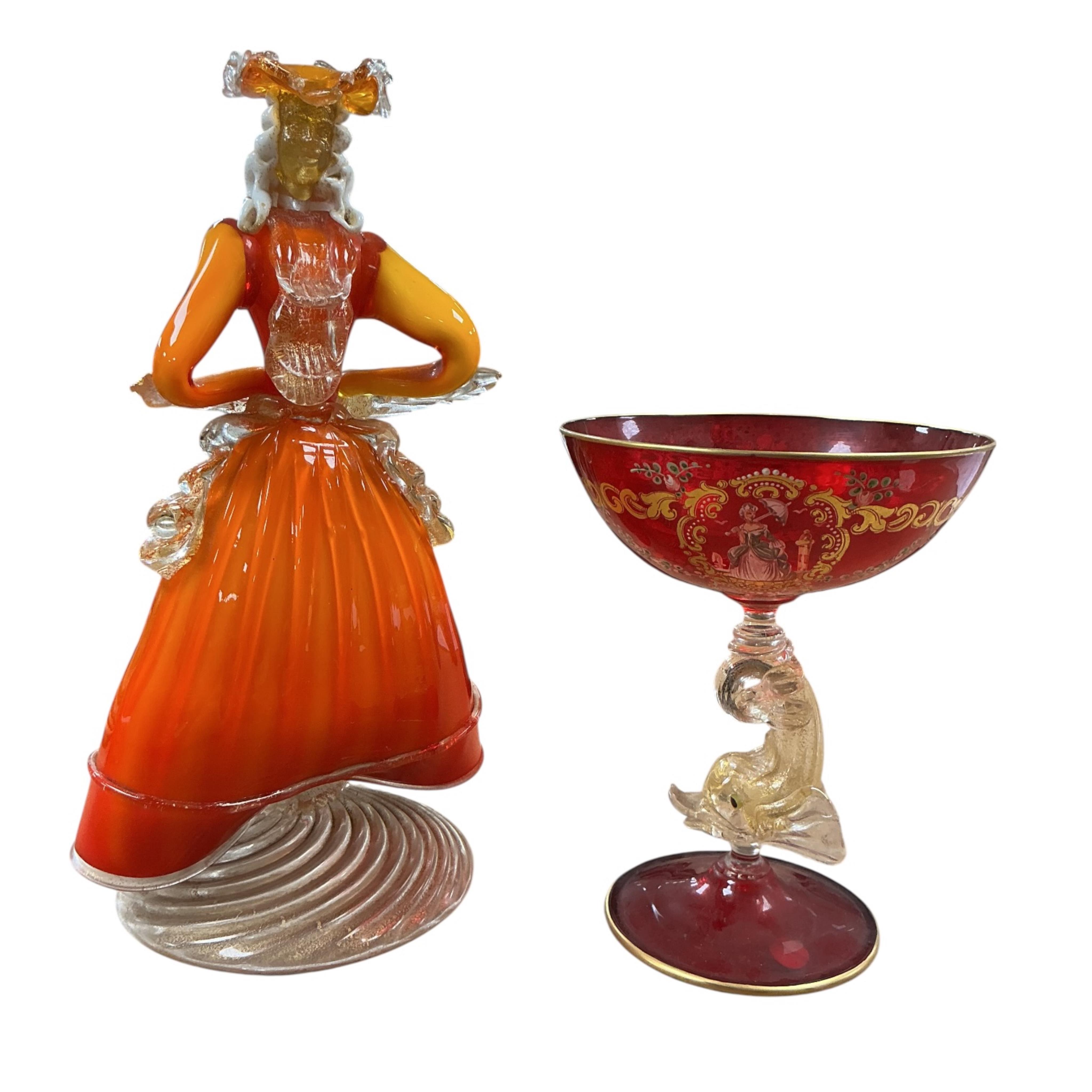 A Murano coloured glass female figurine and a facon de Venise goblet with dolphin design stem, largest 25cm high