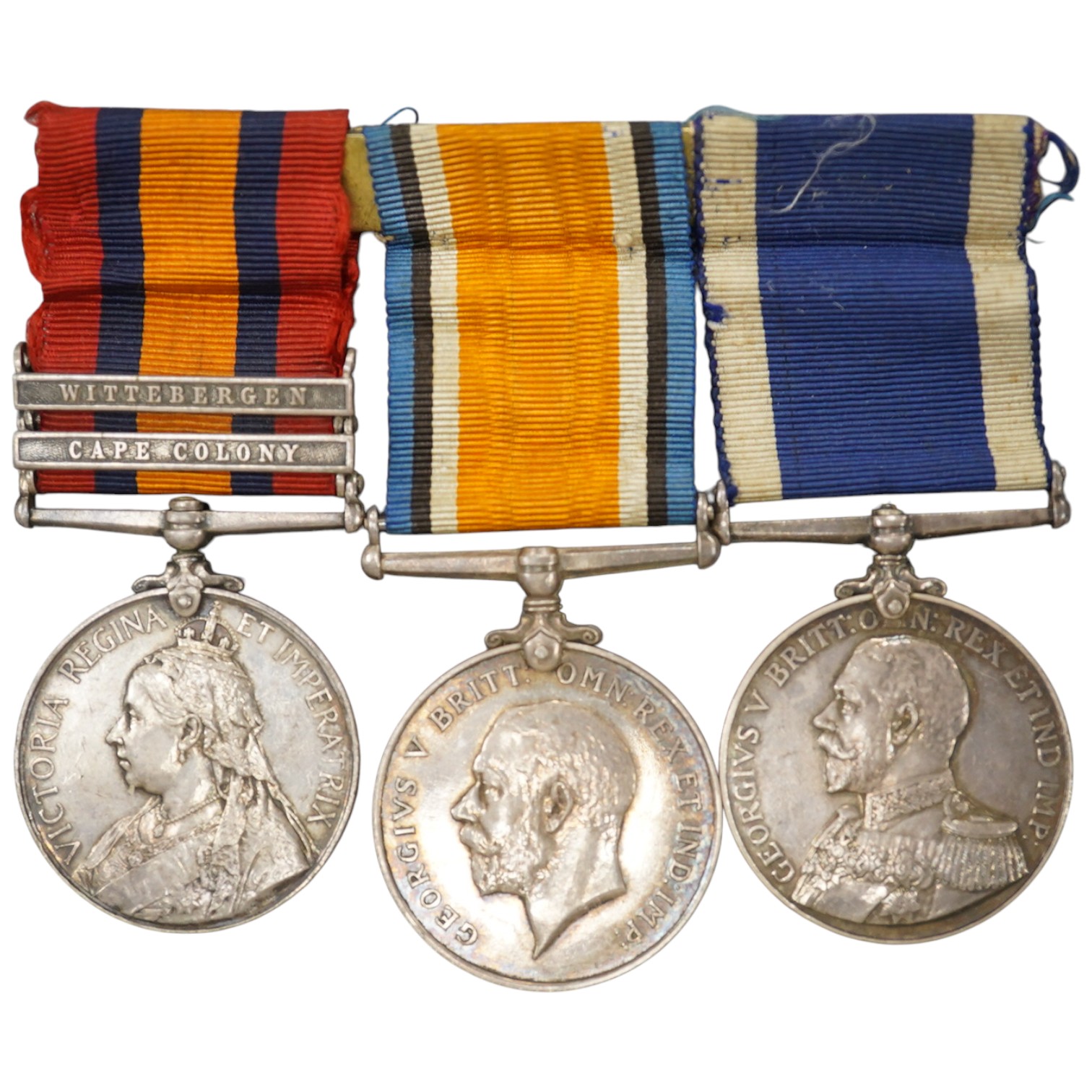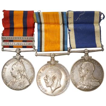 A Naval QSA medal group awarded to 139898 Geo. T. Ashlee. CH. STO. H.M.S. Sappho, comprising the Queen’s South Africa medal with claps for Cape Colony and Wittebergen, a 1914-1918 medal and a naval Long Service and Good Conduct medal