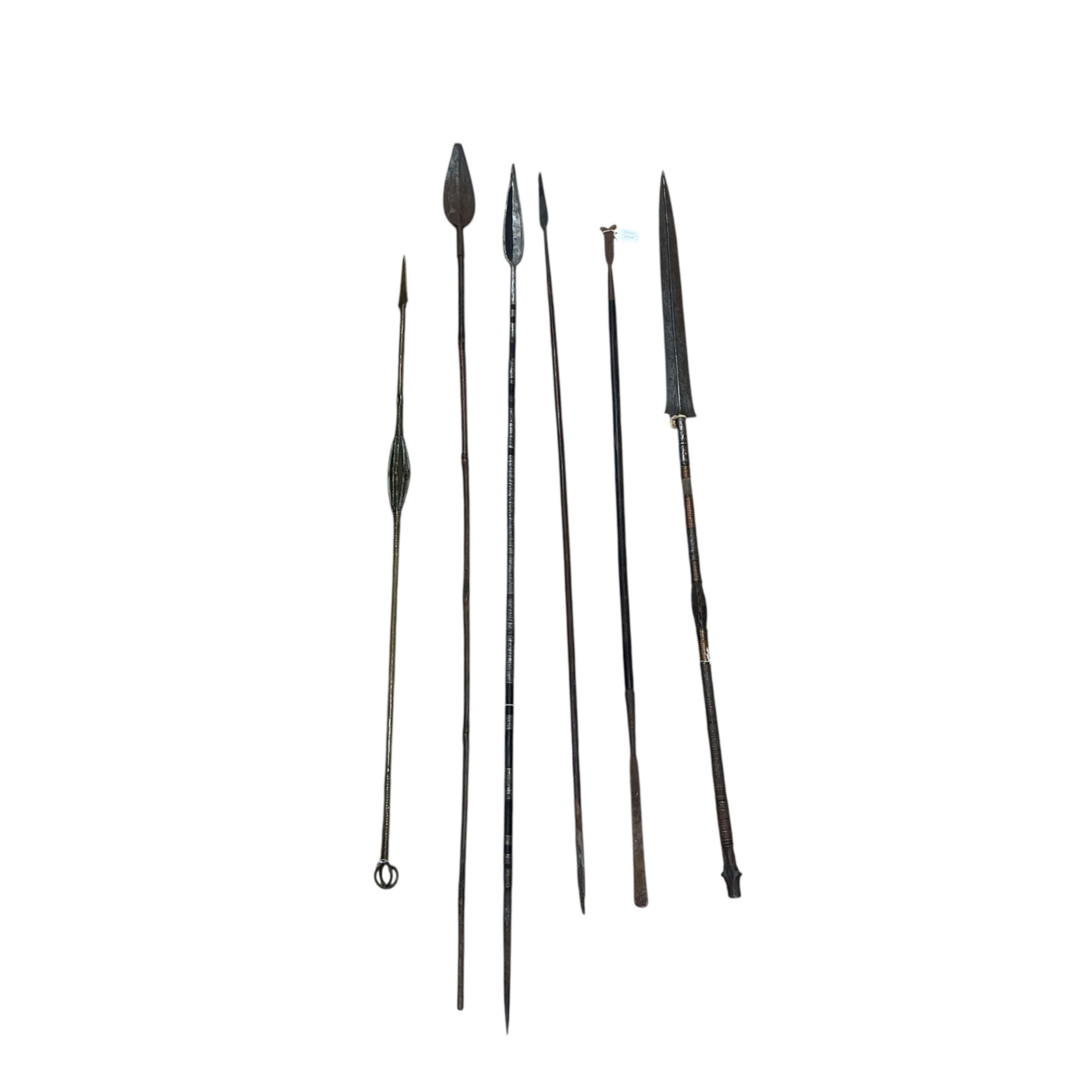 A Ngombe spear, Democratic Republic of Congo, four African Spears and a metal tipped staff (6)